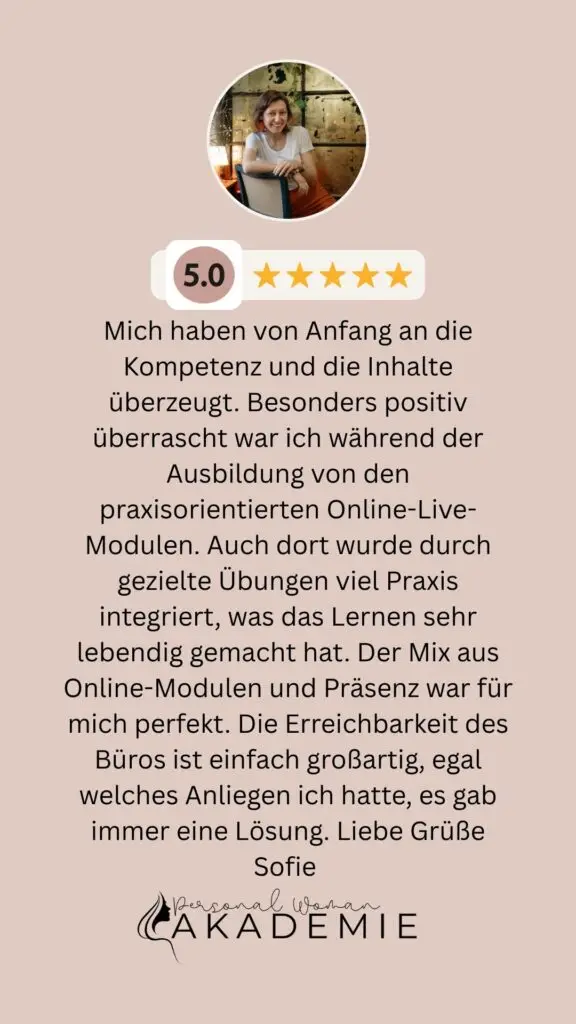 Gerade dieser Mix aus intensiver, praxisnaher Wissensvermittlung und flexiblem Zeitmanagement macht die Ausbildung perfekt für Frauen mit Beruf, Familie oder anderen Verpflichtungen.