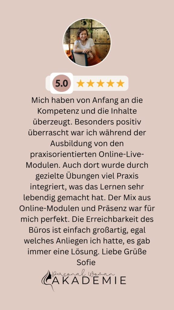 Gerade dieser Mix aus intensiver, praxisnaher Wissensvermittlung und flexiblem Zeitmanagement macht die Ausbildung perfekt für Frauen mit Beruf, Familie oder anderen Verpflichtungen.